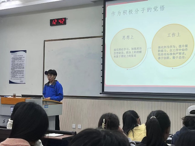 仪式始伊,先由陈佳昊同学向大家讲述了这一年多来他作为积极分子的感悟与经验,他呼吁,作为积极分子,在思想上,要积极学习党的相关理论知识,与党组织靠齐;在工作上,坚持高标准和严要求,勤于总结;在作风上,要自信,乐观,敢于挑战。发挥积极分子的模范作用。