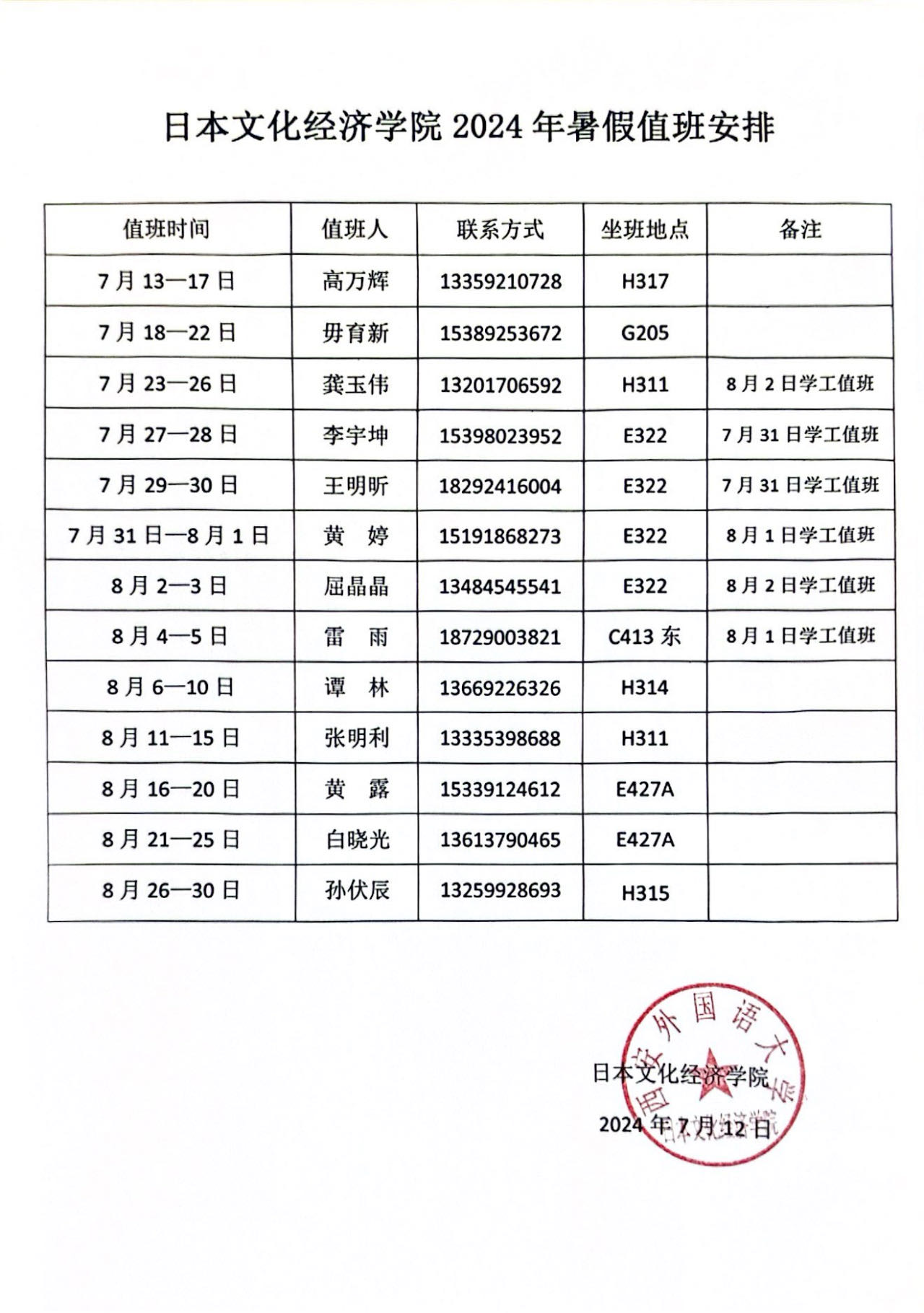 百合漫画 2024年暑假值班安排